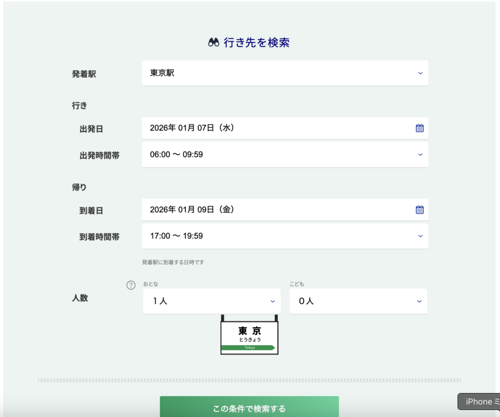 ②希望する発着駅、出発日と出発時間帯、到着日と到着時間帯と人数を選択しこの条件で検索を押下します。(今回は東京駅発)