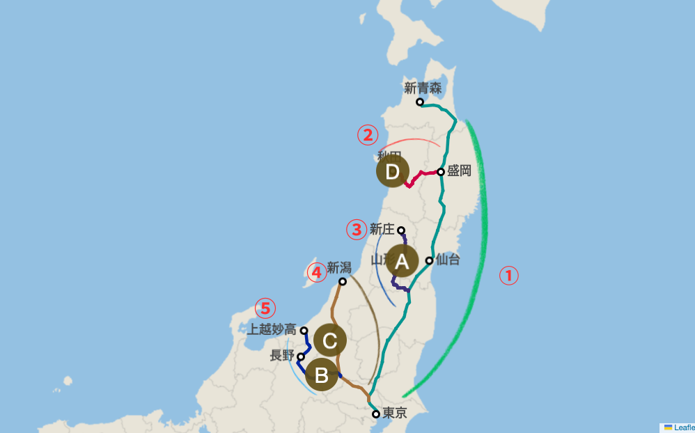 まず前提として、どこかにビューーン!は下記画像の①〜⑤の中から4つの新幹線のそれぞれの停車駅が選ばれるような仕組みとなっています。(同じ新幹線の停車駅が二つ選択肢に選ばれるということはありません。)